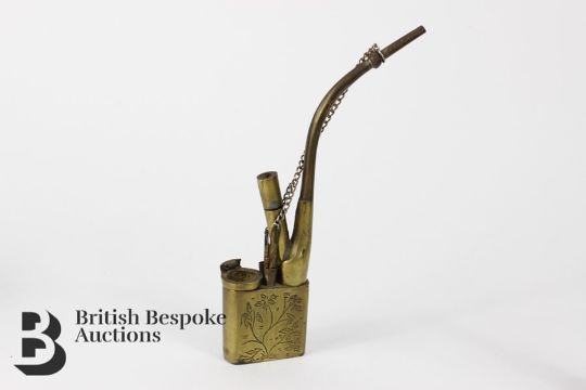 Miscellaneous items. This lot includes a Chinese brass opium pipe with character marks to base; an unusual bell with figural handle approx 17 h cms and a boxed Broseley Shropshire clay tobacco pipe. (3)