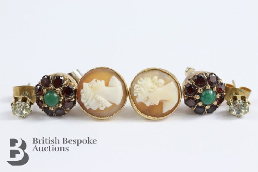 A pair of 9ct gold cameo earrings, and 9ct garnet and turquoise ear studs, approx 4.5 gms together with a pair of yellow metal white stone earrings. (3)