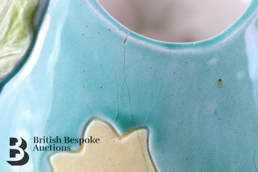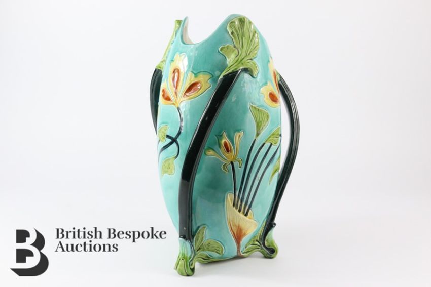 A Wilhelm Schiller and Sons turquoise vase with floral art nouveau design and three black handles,  marked WS&S 14068 to base. Vase measures 32cms in height.