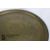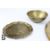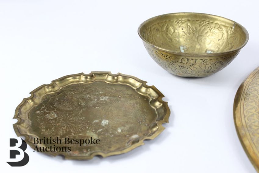 Cairo-ware brass tea table. The brass tray fits onto an x-frame wood base, approx 57 cms diameter, the brass tray having foliate decoration, together with a Cairo-ware tray engraved with arabesque approx 39 cms d, brass bowl approx 13 cms d x 5 h cms and a small brass tray approx 15.5 cms.