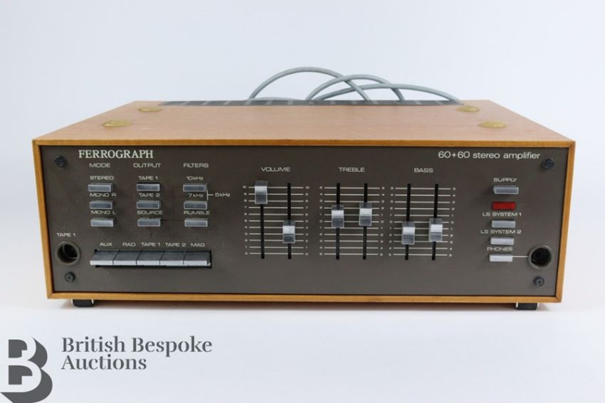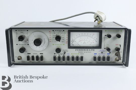 A Ferrograph Reel to Reel recorder serial no 5725, together with a Ferrograph recorder test set R.T.S.2, serial 3159, and a Ferrograph 60+60 Stereo Amplifier.