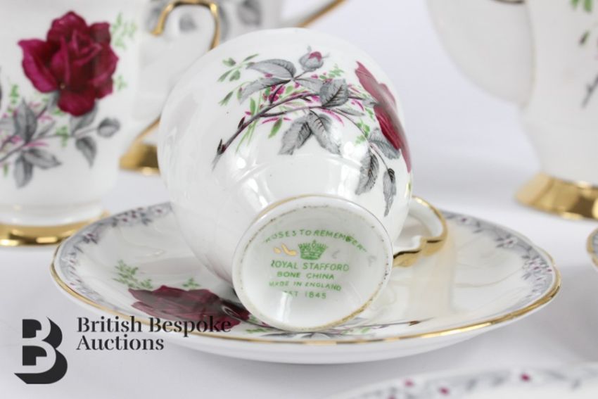 Royal Stafford 'Roses to Remember' porcelain tea set, comprising large tea pot (af), bachelor tea pot, large coffee pot, water pot, eleven tea cups, sixteen saucers, six demi-tasse and six saucers, two sugar bowls and two milk jugs (one af), fifteen cake plates, sandwich plate.