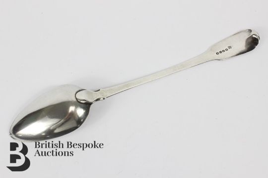 Silver serving and basting spoons. This lot includes a boxed set of Georgian silver serving spoons, London hallmark, dated 1813 mm Robert Eley in the original retailer box Henry Lambert Clifton Bristol, 98.5 gms together with a Georgian silver basting spoon dated 1809, mm William Eley, William Fearn & William Chawner. (3)