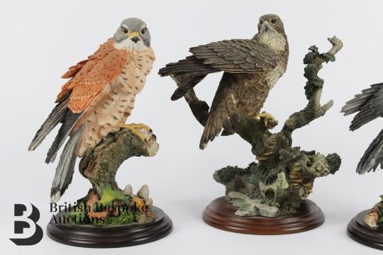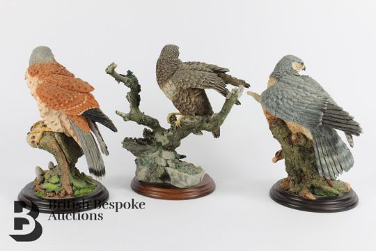 Border Fine Arts figurines, including Kestrel 01016 on a circular base, approx 32 cms h; Buzzard 01286 on a circular base, approx 32 cms h and Sparrow Hawk 01123 on a circular base, approx 24 cms h. (3)