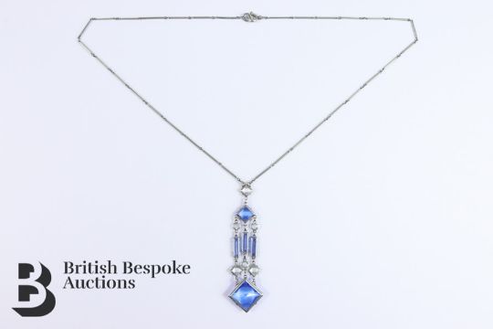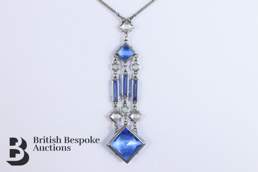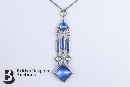 Early 20th century white metal and blue glass pendant, length of the drop is 65 mm, overall length approx 40 cms.
