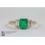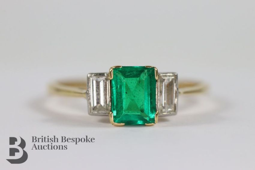 Art Deco 18ct emerald and diamond ring. The emerald measures 5.8 x 4.8mm, flanked by two baguette-cut diamonds approx 2 x 10pts, size O, approx 1.8 gms.