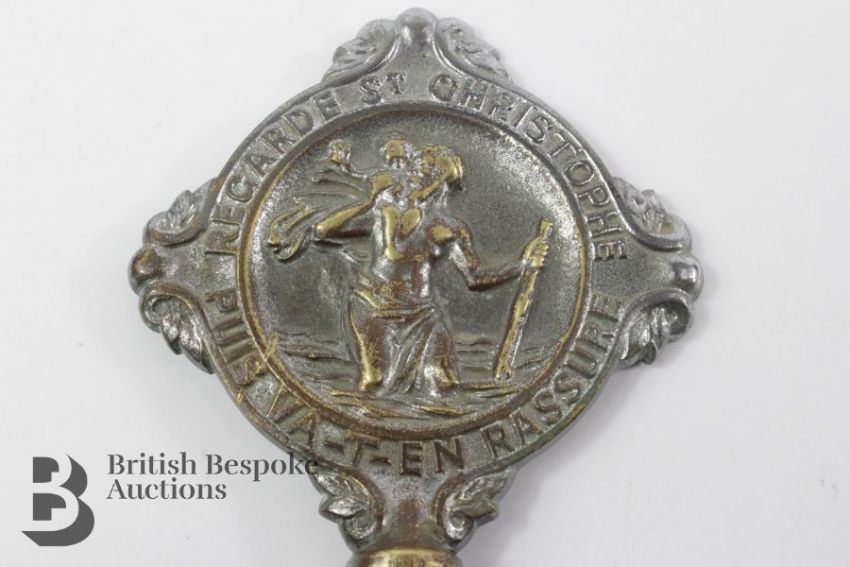 Desmo 1930s chrome on brass showroom display piece, depicting a race horse, approx 5 x 11 cms. Together with Desmo 'St Christopher' motor car mascot/badge, with Desmo and copyright marks to base, circa 1920s or early 30s. (2)-