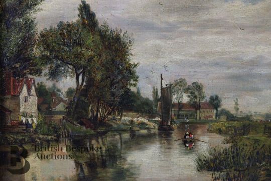 19th century oil on board, untitled, charming riverside scene, monogram HH, approx 23.5 x 18.5 cms, framed. Note: Property of a Cheltenham lady.