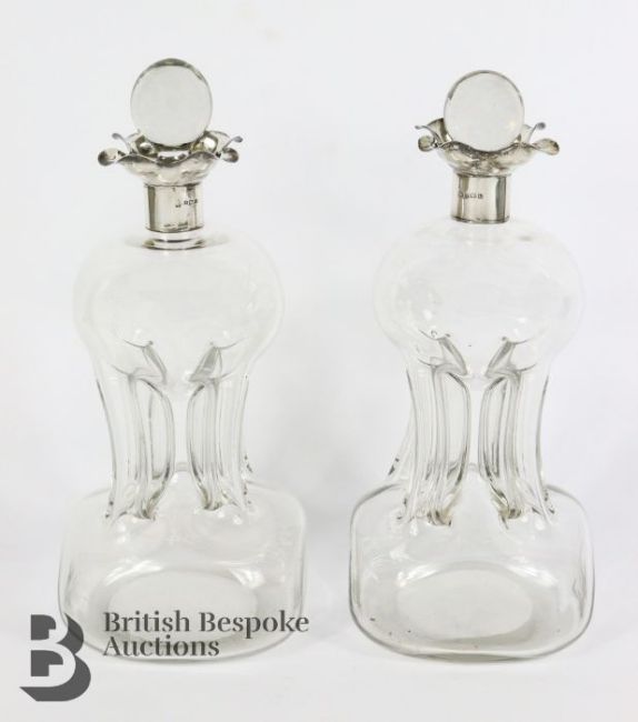 Pair of George V glug-glug decanters, silver collared, Birmingham hallmark, dated 1927, mm William Hutton, 24.5 cms h.