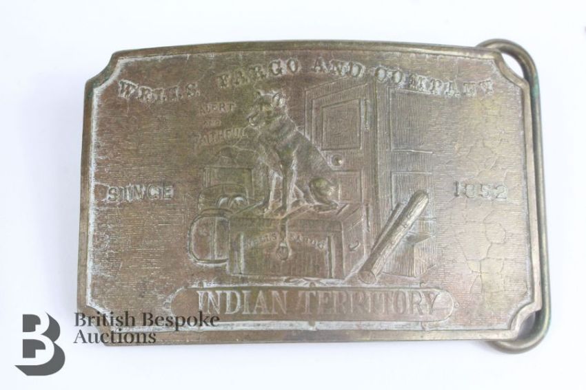 WWI era leather belt with brass buckle stamped 36, approx 115 cms in length together with a Tiffany Wells Fargo belt buckle since 1852 Indian Terrirtory and another Tiffany Wells Fargo belt buckle Texas Central, both approx 10 x 6 cms.