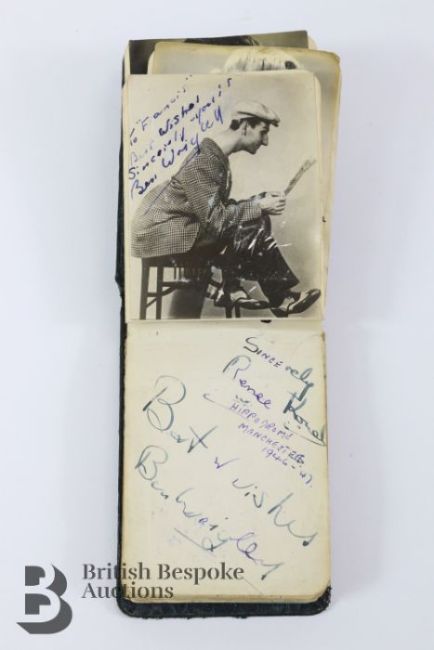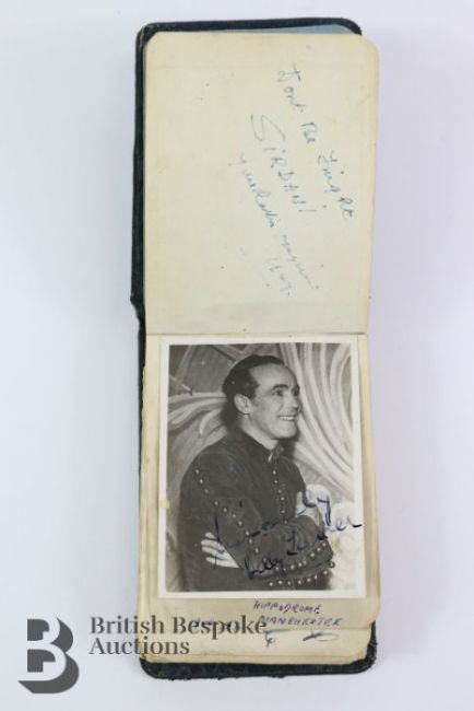 A vintage autograph album with signatures dated between 1946 and 1947, including some that performed at Manchester Hippodrome Theatre. Autographs include The Ganjon Brothers and Juanita, Terry Bartlett, Carroll Levis, Suzette Tarri x 2, Max Bacon, Duggie Wakefield, Renee Dandine, Harry Hemsleym Tommy Joves, Harry Korris, Cecil Frederick Ramsbottom, Harry Morris and Frank Cowley (The Vesta Brothers), Elsie Waters and Doris Waters, Nat Jackley, The Two Lesleys, Jimmy O'Dea, Billy Colton, G H Elliot, Joy Hayden, Jack Lane, Max Bacon etc. Approx. 69 signatures.