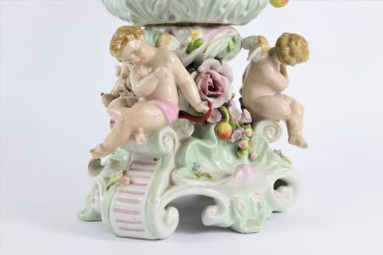 Continental table centrepiece, porcelain fruit bowl, profusely decorated with flowers, berries, fruit and putti in relief, approx 30 cms in height. (af)