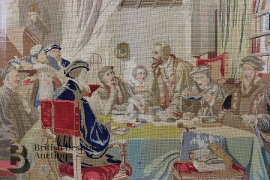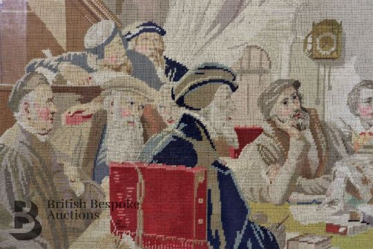 Large 19th century embroidery, portraying 17th century intellectuals in annimated discussion, approx 105w x 85 h cms, framed and glazed.