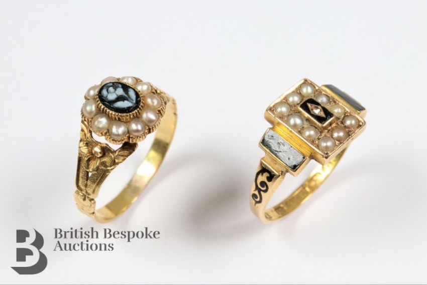 15ct yellow gold, enamel (scratched) seed pearl mourning ring, mm A.A, dated February 1886 and inscribed ' Wyncoll', size L, mm AA together with another 18ct black cameo and seed pearl mourning ring, size M, 2.15 gms. (tested)