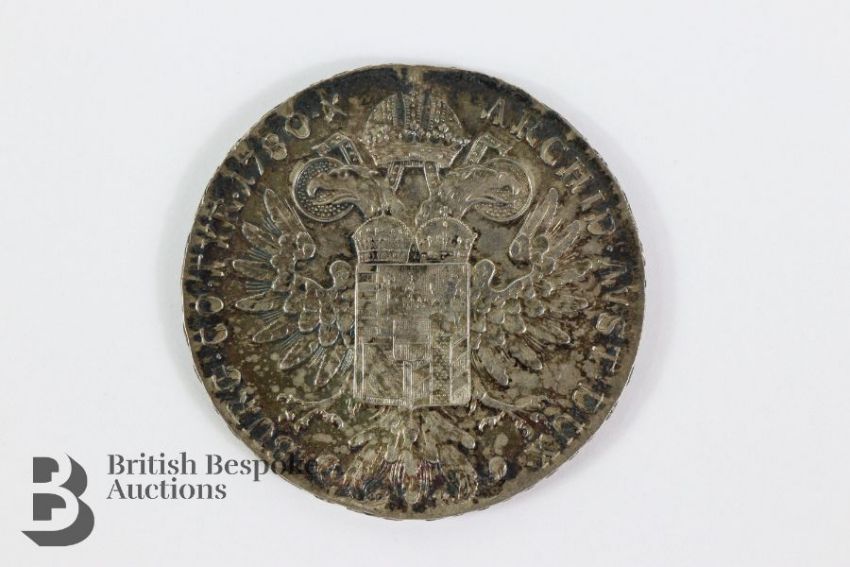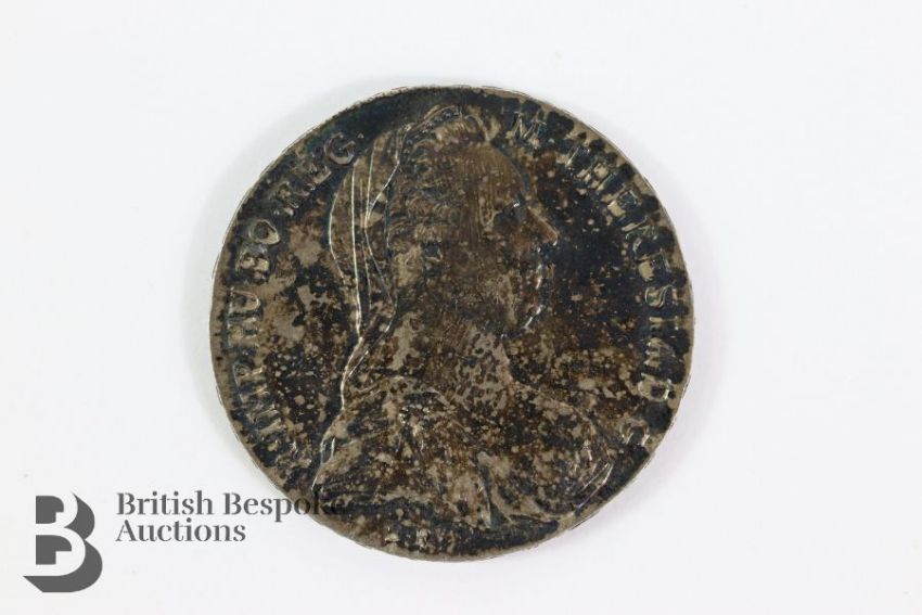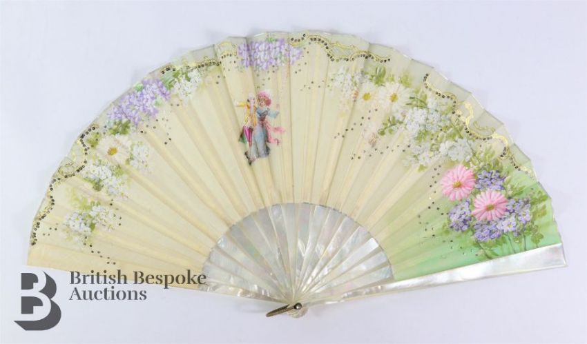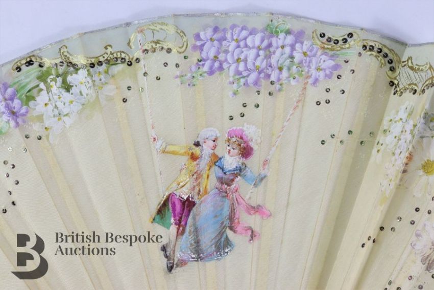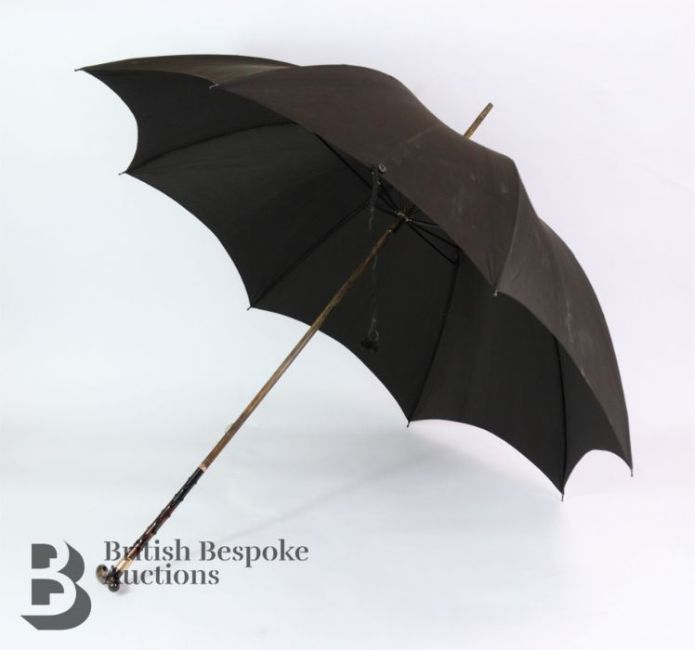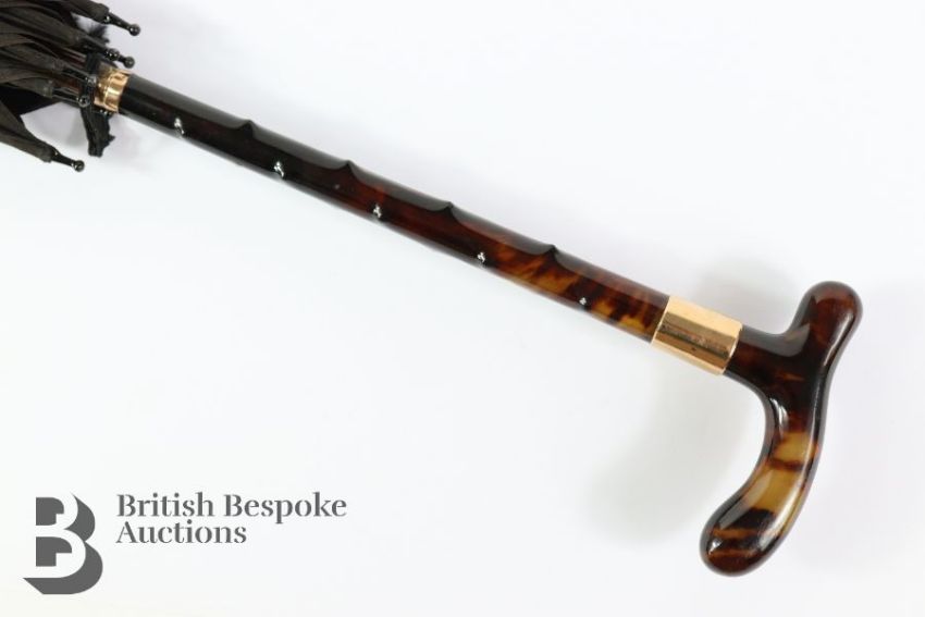 Edwardian lady's black parasol with tortoiseshell-effect shaft with a 9ct gold handle ring and a 9ct gold collar, both stamped 975, Chester hallmark dated 1905, mm EA, engraved May Spencer; together with a 19th century silk fan hand-painted with wisteria, daisy two figures on a swing, heightened with sequins and gold paint, mother of pearl sticks, approx 44 cms w and a Marie Teresia 1 Thaler silver coin. (3)