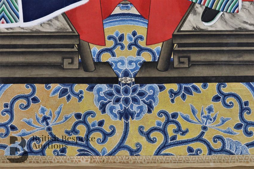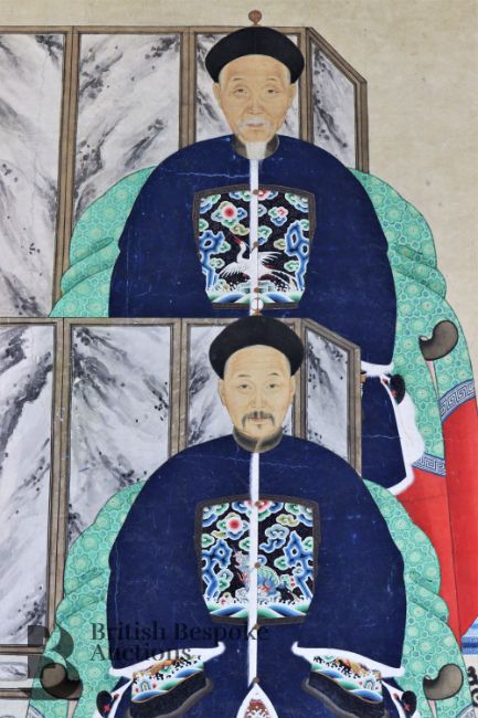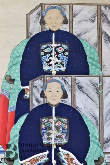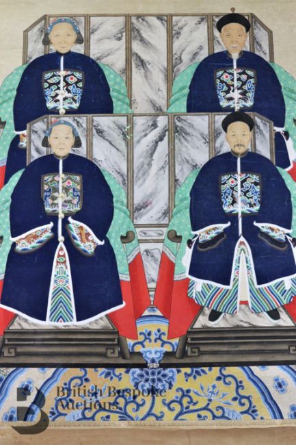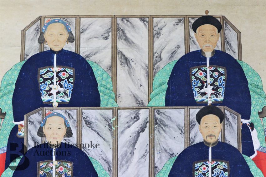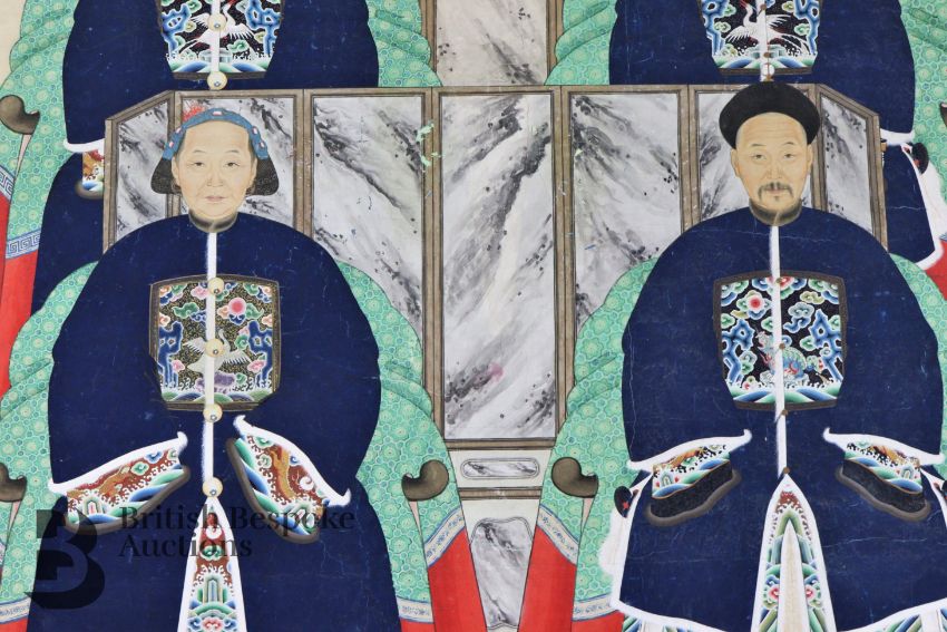 Mid-19th century Chinese ancestral scroll painting, sizeable, ink and colour portraying four figures seated before room screens, the dias resting on a blue and gold Chinese carpet, dressed in formal attire with rank badges, black Chinese character marks to scroll frame, approx 81w x 190 h cms.