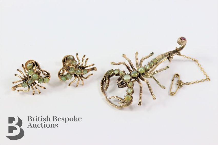 Edwaridan 9ct yellow gold scorpion brooch set with moonstone and ruby eyes together with matching earrings. The brooch measures 55 x 35 mm, approx 14.84 gms.
