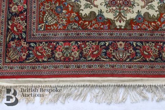 Persian 20th century Persian Qum rug. The rug being of floral design with a cream central field of bouquets of flowers surrounded by a double geometric border with a field of flowers within it, both selvedges and tassels are in good condition, approx 285 x 197 cms. This rug has been hung on a wall and therefore in good condition.