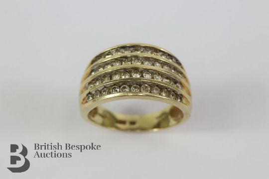 9ct yellow gold channel-set diamond ring, set with approx 1ct of dias, size P, approx 5.9 gms.