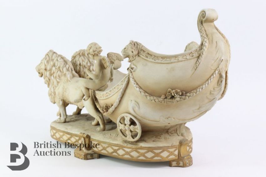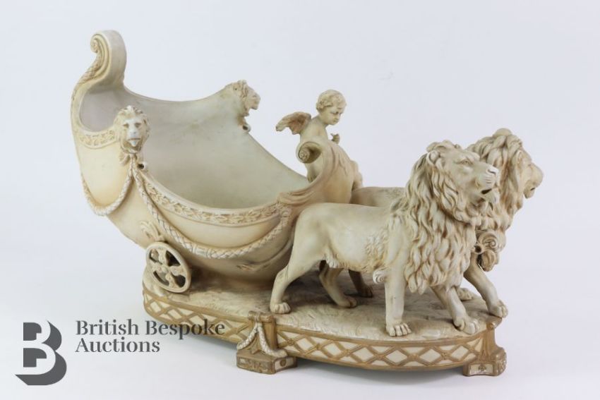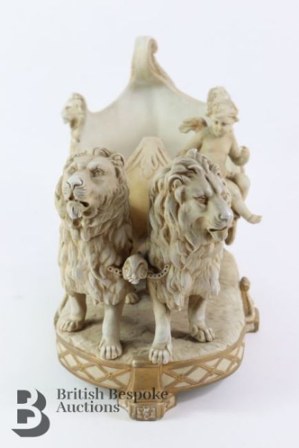 Bohemian ceramic group, 19th century, shell-form chariot drawn by two lions with a seated cherub, approx 44 cms x 27 h cms, factory marks to base.