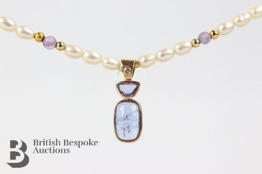 Yellow gold amethyst, diamond and pearl necklace, approx 48 cms, drop measures 25mm, 3.96 gms together with a 9ct graduated diamond pendant and a 9ct diamond star pendant approx 1.3 gms, set with  approx   pts of dias.