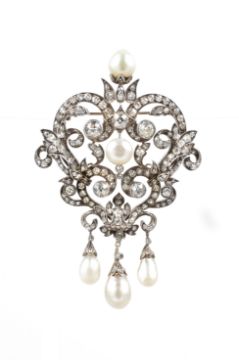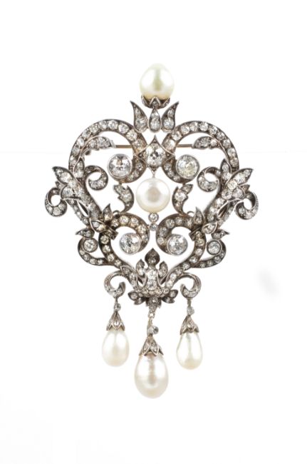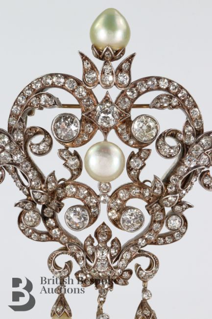 A substantial & exquisite Belle Epoque circa 1840 French heart-form pomp brooch, gold with silver mounts set with approx 8+ carats of brilliant-cut diamonds crowned with a natural oriental pearl of 12mm. The brooch is heightened to the centre with a natural oriental button pearl of 7mm and three further natural oriental pearl drops of approx 12 to 14mm, the brooch measures approx 60 x 95 mm, approx 56.8 gms. Provenance: the brooch was given to the mother of the vendor by her brother when the family were residing in Berlin, originally purchased from Oscar Labiner Muchen with original brochure.