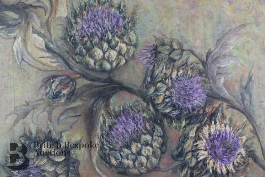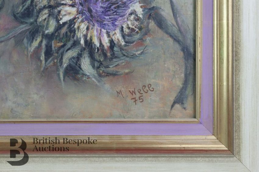20th century oil painting of flowering globe artichokes, signed M Webb dated 1975, framed, approx. 75 x 80cms.