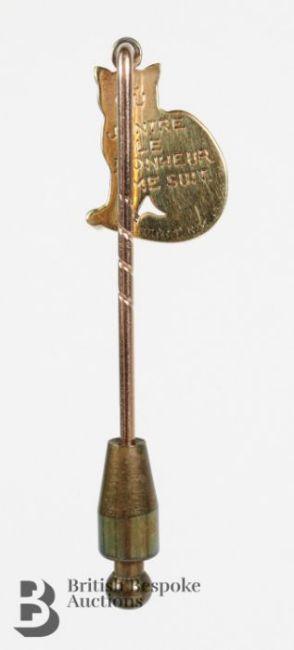 14/15ct yellow gold Cartier 'cat' tie pin. The cat engraved J'entre le bonheur me suit' Cartier New York having emerald eyes. (af)