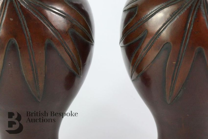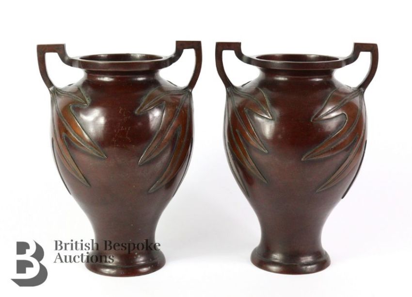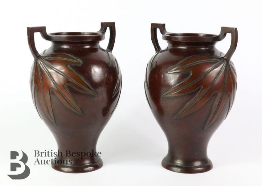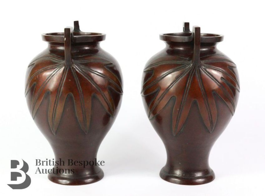 Pair of Japanese bronze twin-handled bulbous vases, the base of the handles expanding out into a leaf motif, approx 23.5 cms, no marks to base.