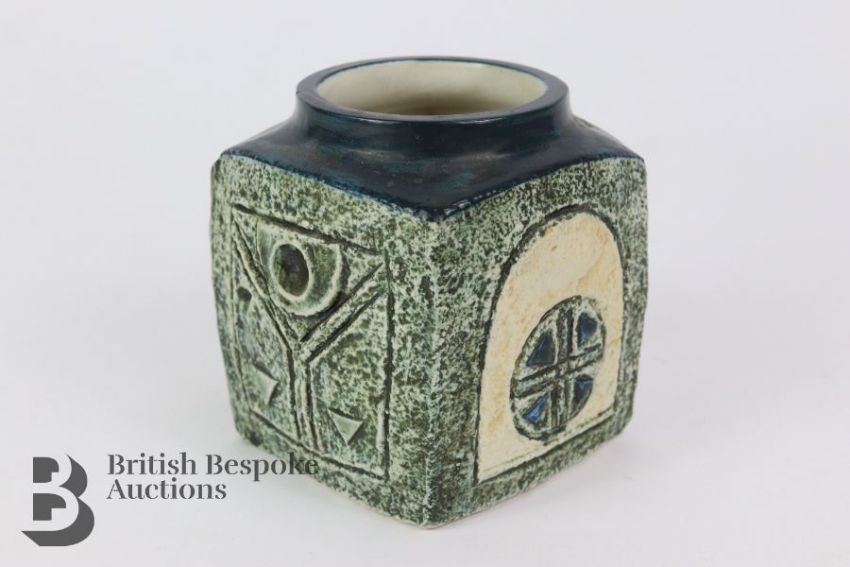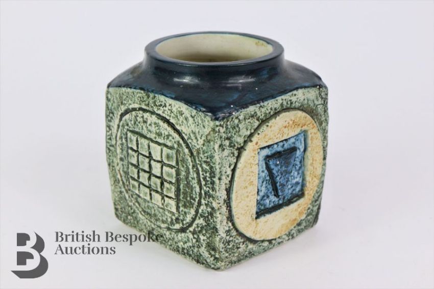 Cornish Troika squat vase, factory marks to base potter F, green, blue and yellow abstract design, approx 10 cms h.
