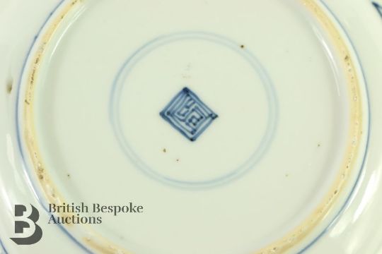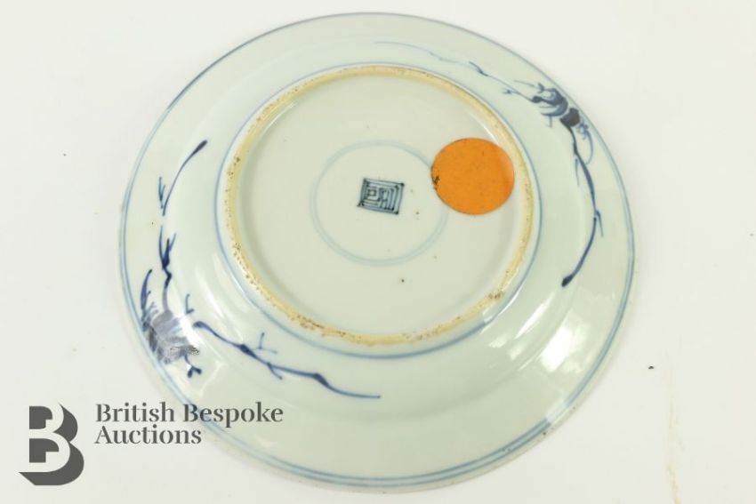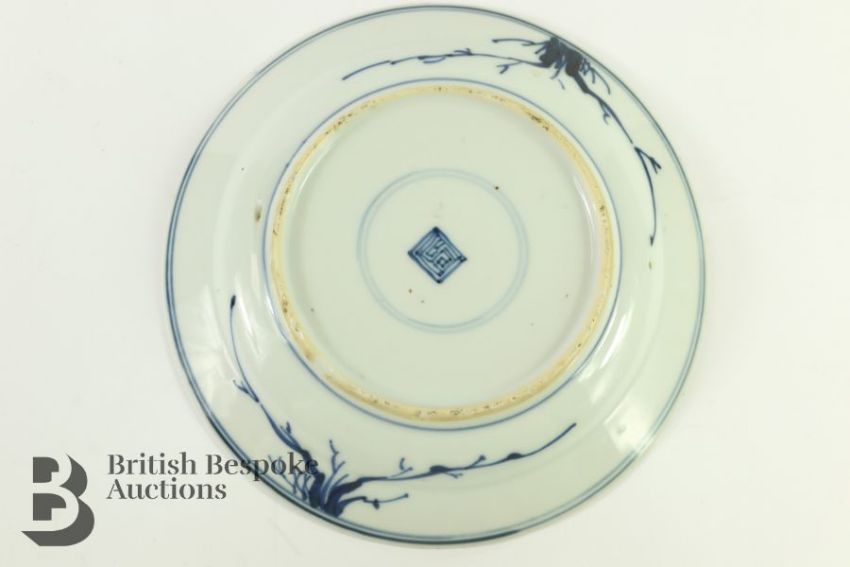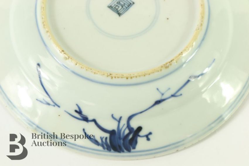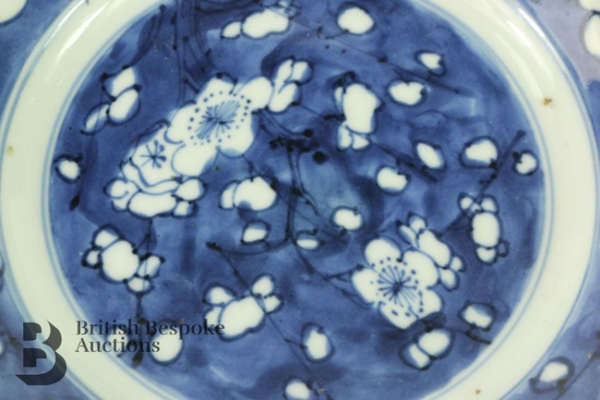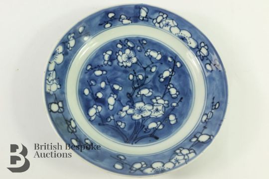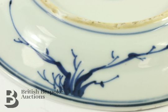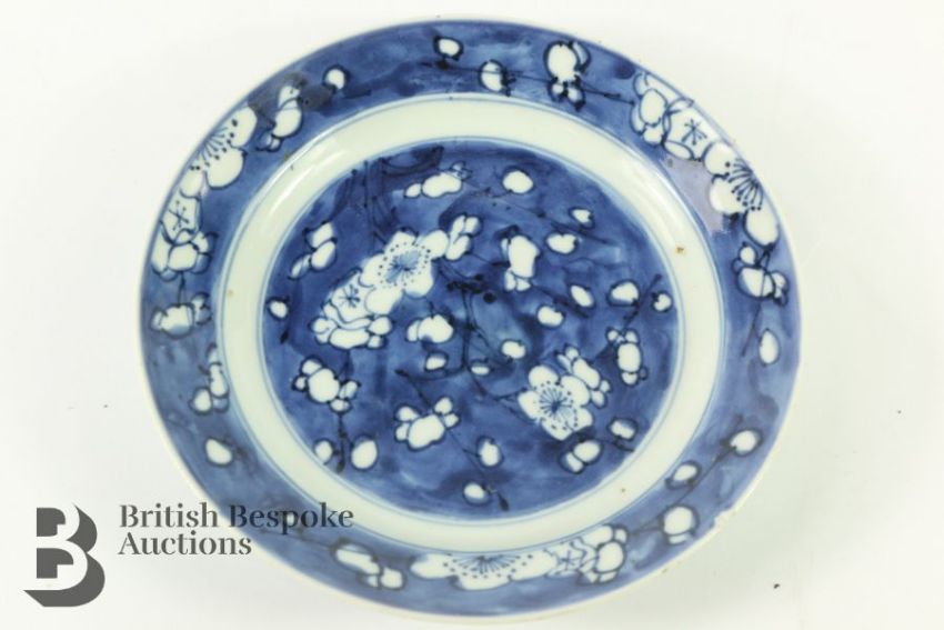 Two antique Chinese blue and white dishes, painted with prunus blossom, approx 15.5 cms. Note: William Booth (1856-1928) collector of antiques including Chinese blue and white and Delft ware, he had a two day sale of his collection in April 1927 where many of theseporcelain pieces were purchased by Cecil Bullivant. Cecil was a family friend of the present owner who bequeathed them to the vendors parents and thus down through the family.