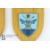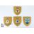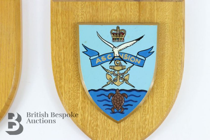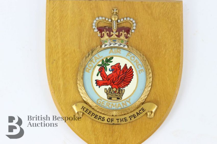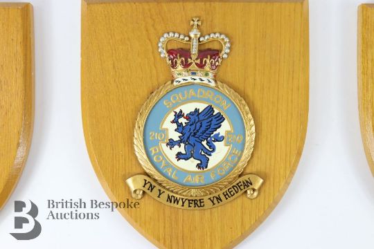 Four wooden shields, one mounted with RAF Squadron 192 'Dare to Discover' badge and another with a Royal Navy Ascension badge, the third shield is mounted with an emblem for the German Airforce inscribed 'Keeper of the Peace' and lastly a shield with a Royal Airforce badge for Squadron No 210 with inscription in Welsh 'Yh Y Nwyfre Yn Hedfan'.