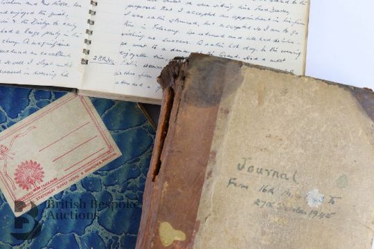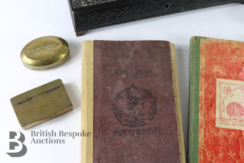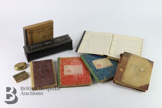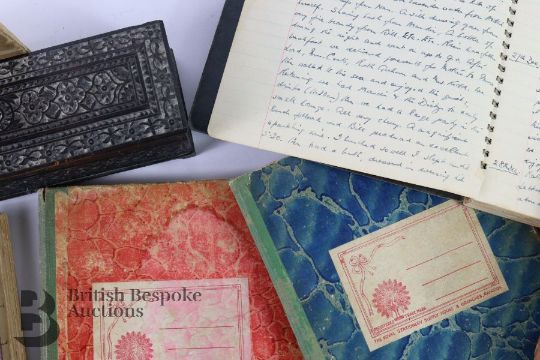 WWII era memoirs, a diarised account by Major T.W Fawell of the 10th Baluch Regiment (British Indian Army), from the years 1941-1947, whilst stationed in Karachi (present-day Pakistan). The memoir account is written in six exercise books and make an almost daily or weekly account of the 'goings on' during this time. This lot includes an Indian pen box decoratively carved approx 27 x 8 cms (hinge broken), together with two brass trench art snuff boxes, one inscribed Thomas Green Herbert Street Watford and the other David Graham 1875.
