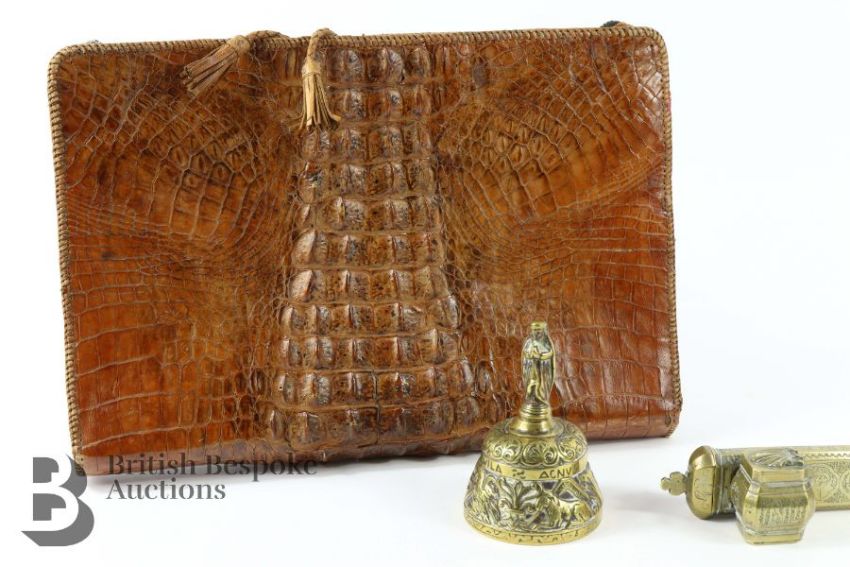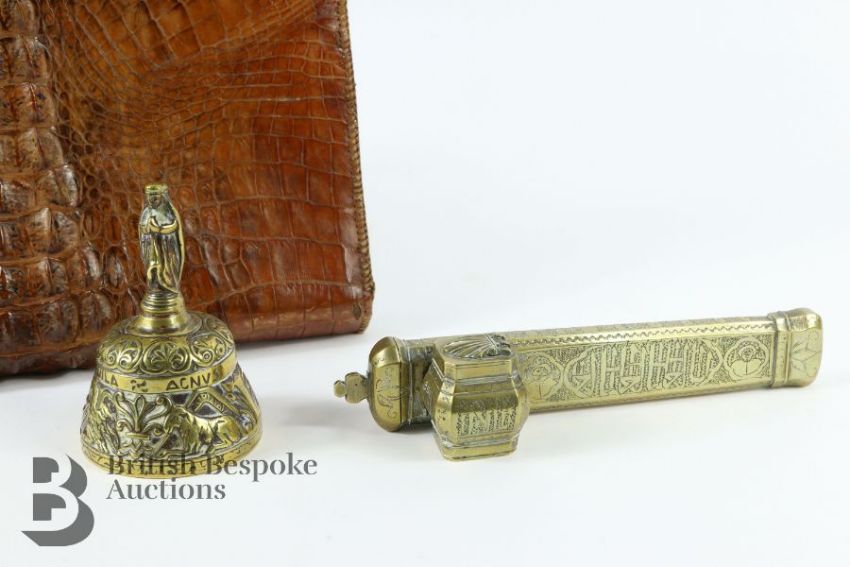 Persian brass travelling inkwell (qalamdan) approx 22 cms in length with incised decoration together with a brass desk bell together with a crocodile-skin stationary folder. (3)