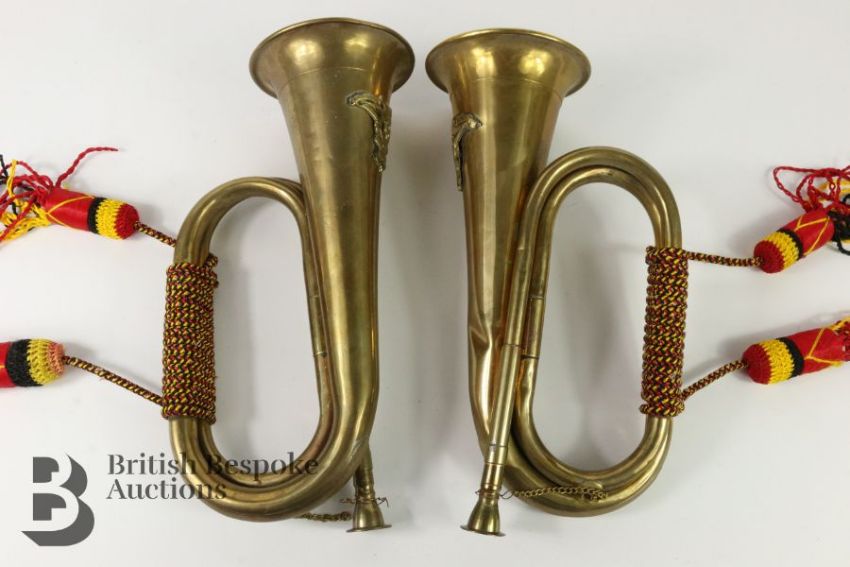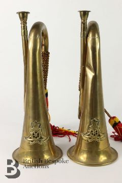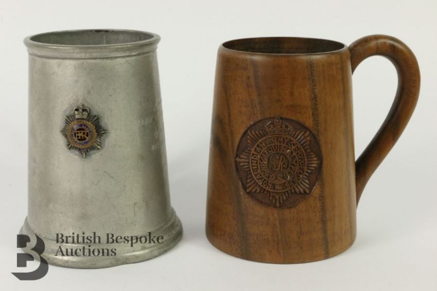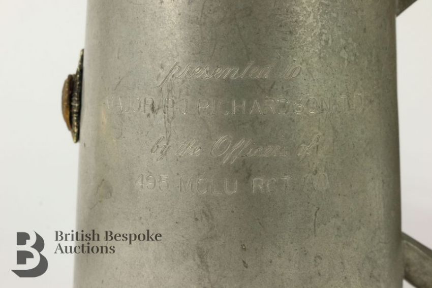 Two military brass bugles, both with Royal Artillery insignia, a Royal Service Corp treen tankard, a pewter regimental tankard to Major Richardson by the Officers of 495 MCLU RCT (V), together with a print of The District Court Cyprus and presiding figures.
