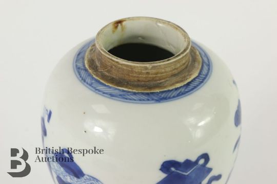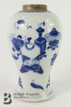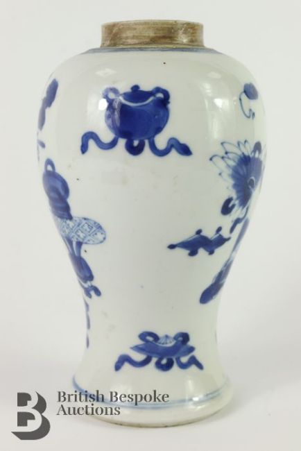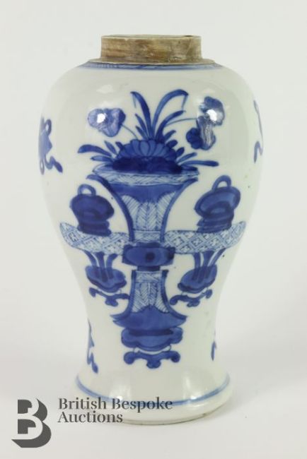 Chinese blue and white baluster vase, circa 1690, Kangxi (1622-1722), painted with ribbon-tied precious objects, approx 15.75 cms h. (af)Note: William Booth (1856-1928) collector of antiques including Chinese blue and white and Delft ware, he had a two day sale of his collection in April 1927 where many of theseporcelain pieces were purchased by Cecil Bullivant. Cecil was a family friend of the present owner who bequeathed them to the vendors parents and thus down through the family. Condition ReportSubject to sympathetic restoration to the rim, the body of the vase is in good original condition.