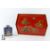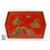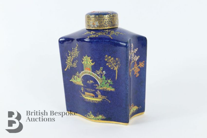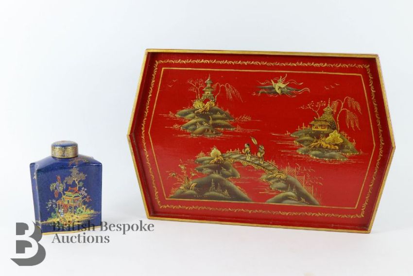 Carlton Ware tea caddy and cover, Pagoda design, circa 1920's approx 15 cms h together with a red tray painted in the Japanese manner, with pagoda, estates and figures on a bridge, approx 29 x 44 cms.
