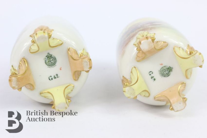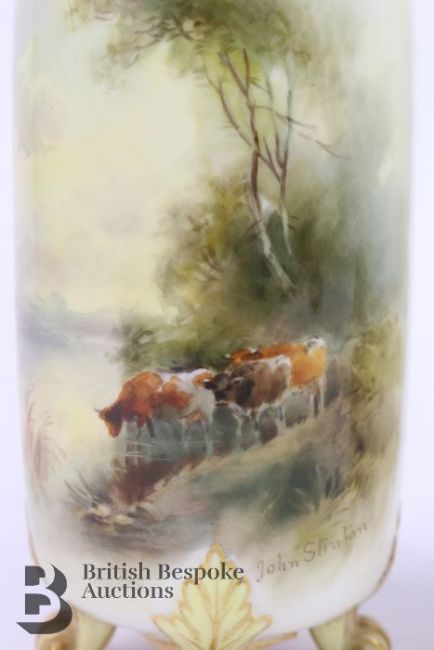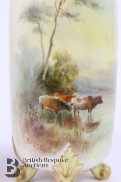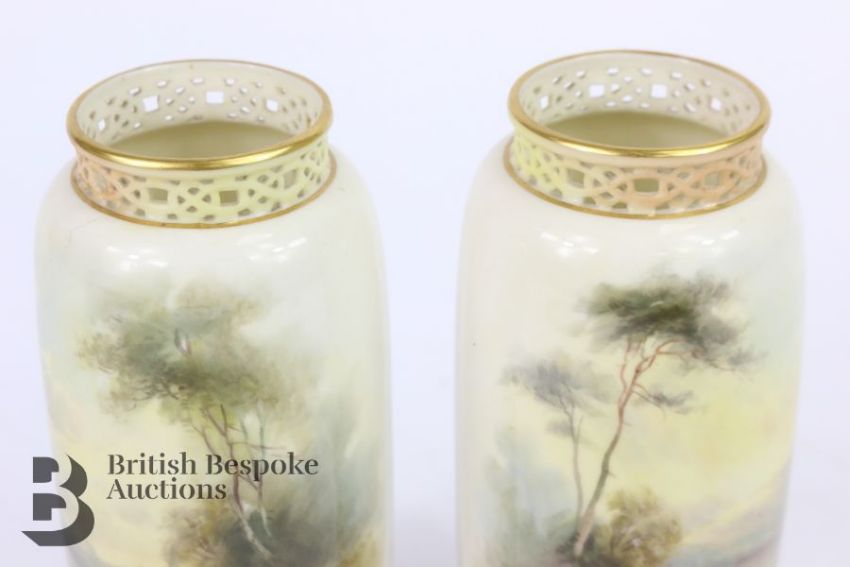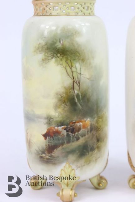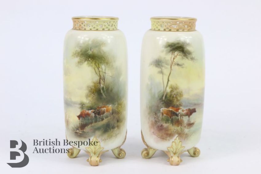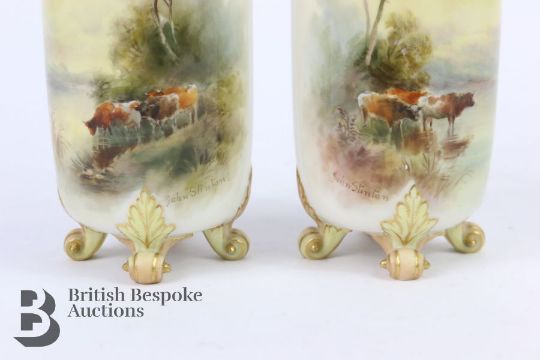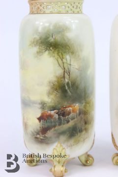 John Stinton for Royal Worcester pillar vases, early 20th century, each vase finely painted with Highland cattle beside a loch, approx 14.5 cms h, supported on four scroll feet with a reticulated neck, green factory marks to base.