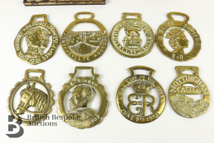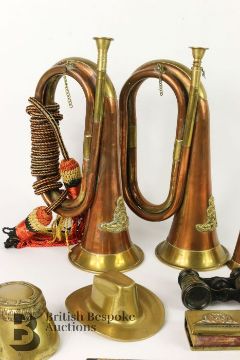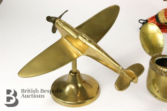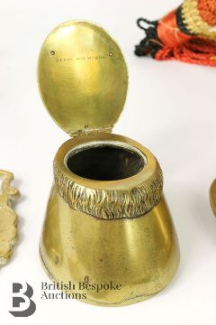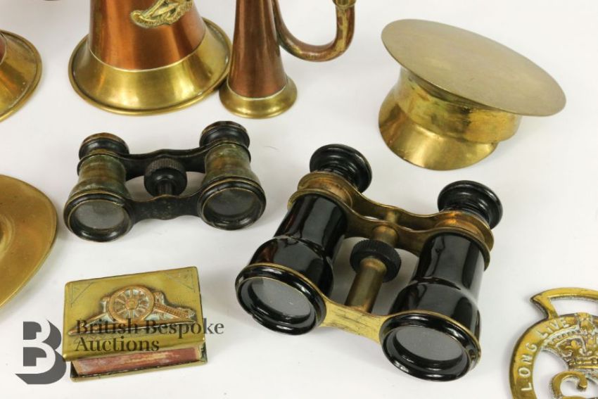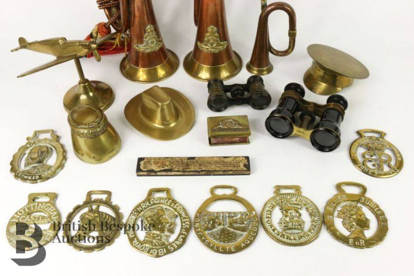 Militaria - comprising two copper and brass Royal Engineers bugles, collection of trench art including a spitfire 16 x 13 cms, a peak cap 11 cms diameter, stetson 12 x 10 cms, Royal Engineers brass match box holder 6 x 4 cms, an inkwell in the form of a horse hoof dated January 1868 engraved 'Deeds not Words' which was a phrase used by 22 Infantry during the American Civil War, miniature bugle, two binoculars. This lot includes eight commemorative horse brasses including Edward VII coronation, Silver Jubilee of QEII, Nottingham Castle, One Shilling 1928, Potcysyllte Aqueduct, Long Live the Queen 1953 and Prince and Princess of Wales horse brass.