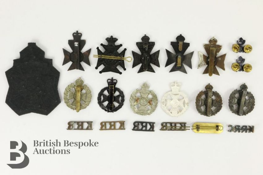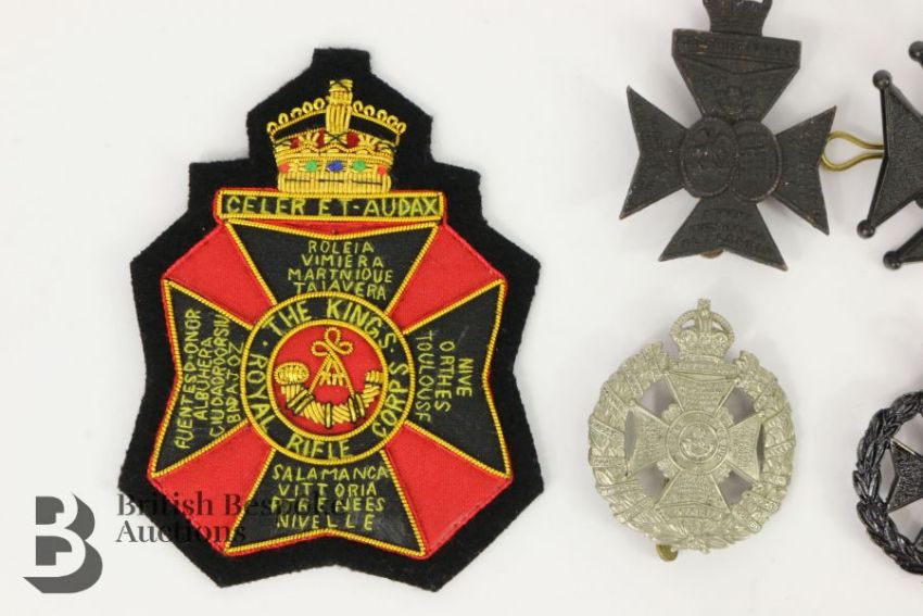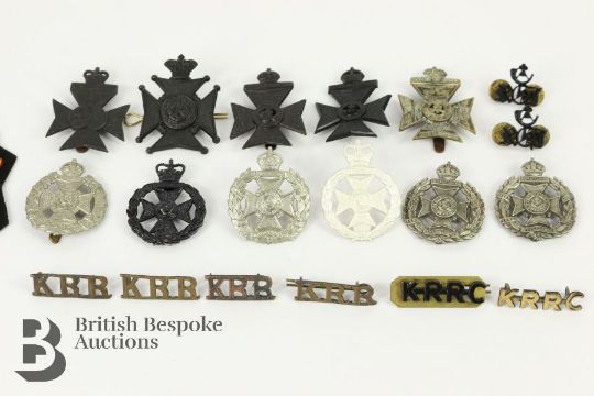 Collection of insignia incuding The King's Royal Rifle Corps, The Rifle Bridge, cap badges and titles etc. also The 8th London Regiment.