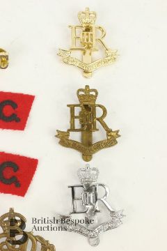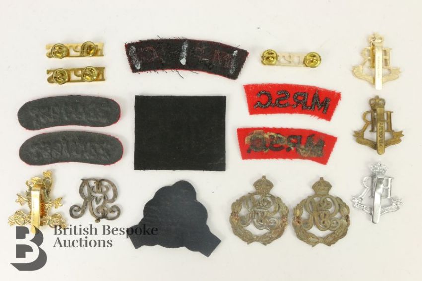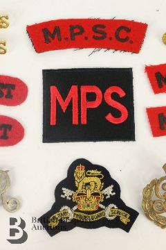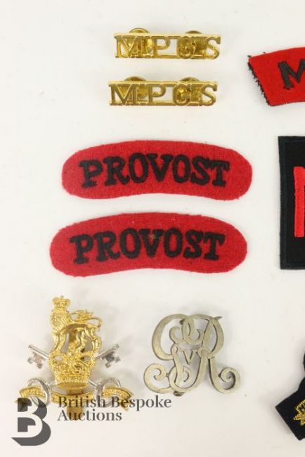 Collection of Military Provost Staff Insignia, including cap badges and titles, various periods.