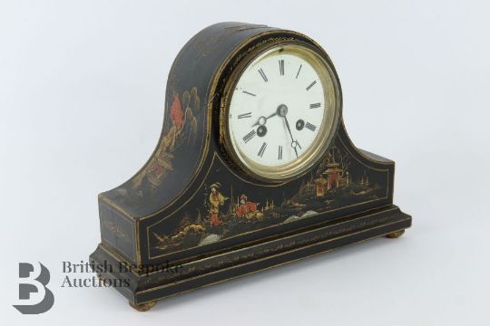 Japanned mantel clock, painted with figures in a landscape, the clock having a white face with Roman dial, Japy Freres movement striking to a bell, approx 28 x 20 cms h.
