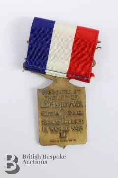 French Victory medal inscribed presented by the 'City of Leominster Mass in grateful recognition for services rendered in WWII' verso reads Pilgrim Badge Boston.