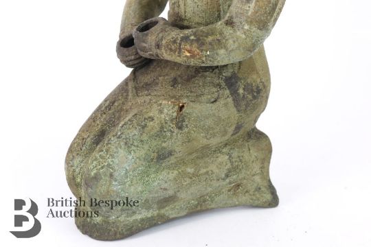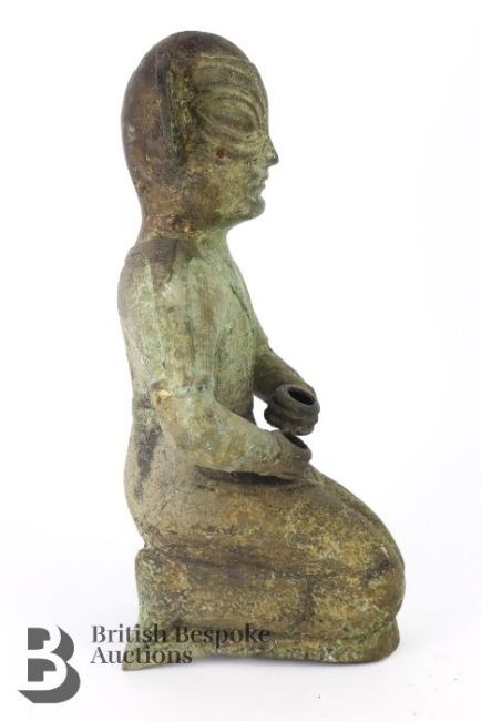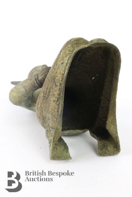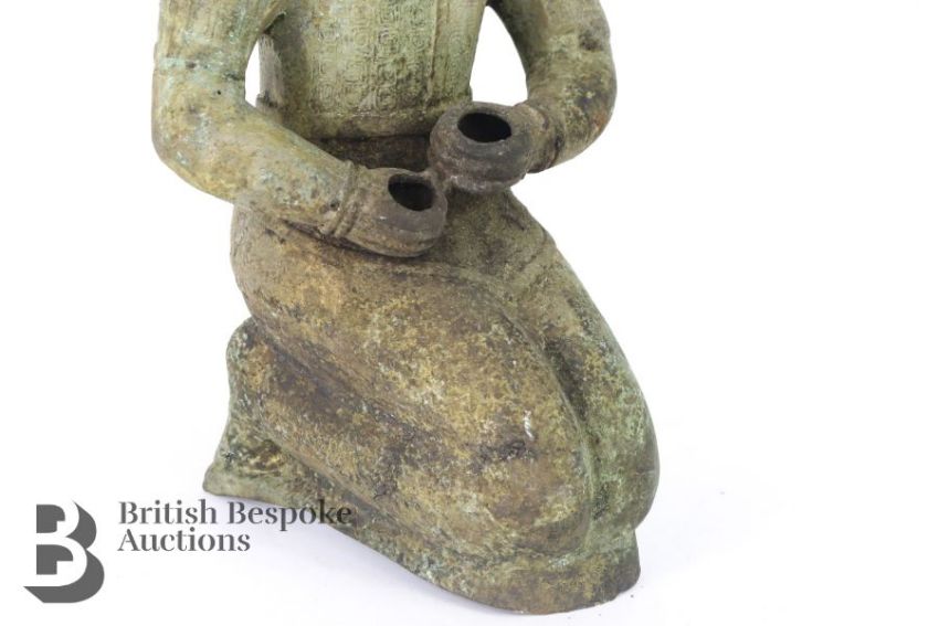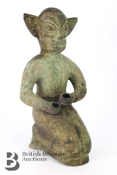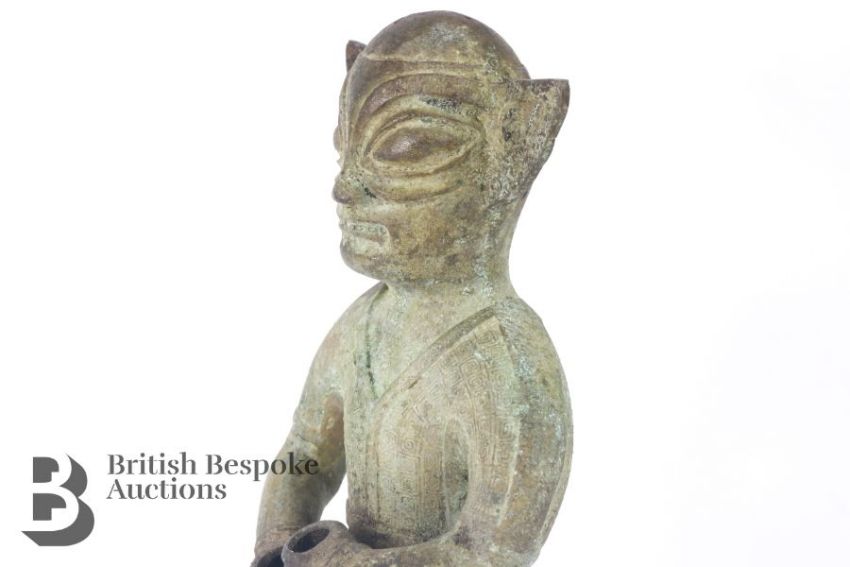 A Chinese cast metal funerary tomb guardian, insiced with a repeating motif, exaggerated features and large ears, resembling those found at Sanxingdui, approx. h 29 x 13 cms.  Condition Report2 cm split in metal to upper leg, small hole, see images.  Possible elements missing from this piece.