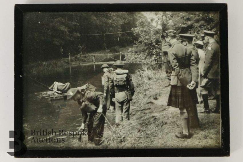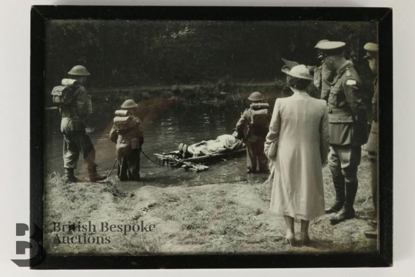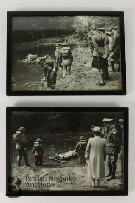 Black and white photographs of King George VI and the Queen Elizabeth (Queen Mother) viewing a practice run of military rescue exercises, believed to have been carried out in Wales, approx 15 x 10 cms.