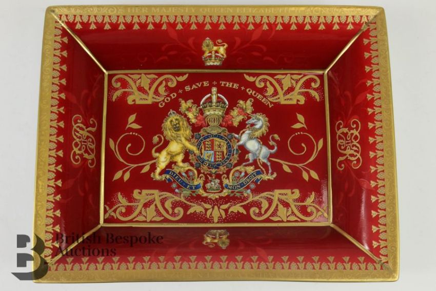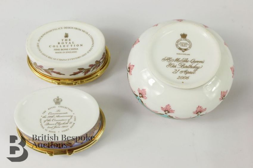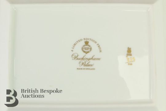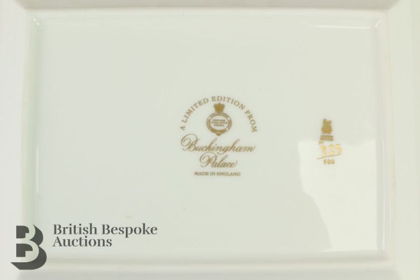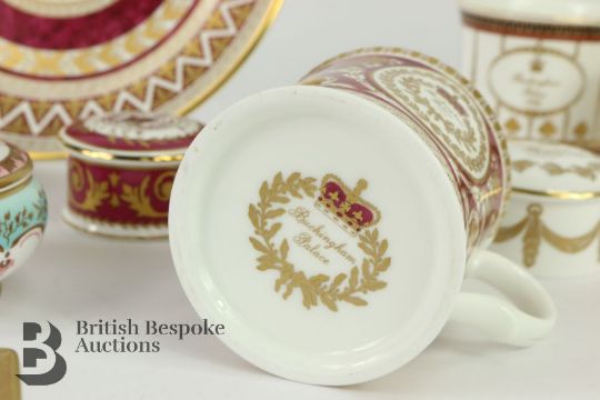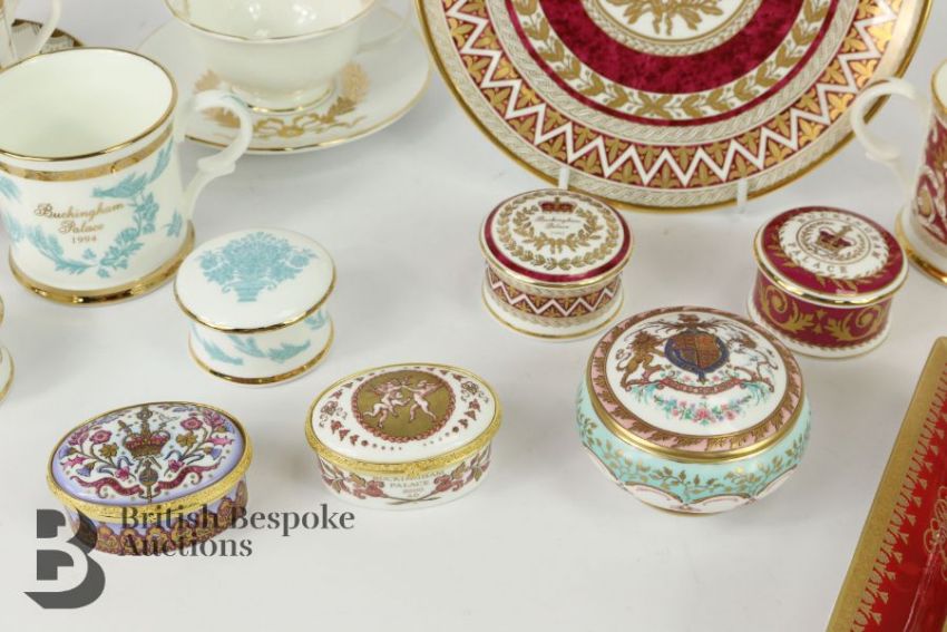 Buckingham Palace commemorative porcelain, comprising: five tankards 1993,1994,1995,1996 and 1997; a limited edition 'God Save the Queen trinket tray 325/500 20 x 16 cms; Buckingham Palace 1995 cabinet plate 22 cms d; The Royal Collection Queen Charlotte cup and saucer and a plain porcelain cup and saucer; together with eight circular Buckingham Palace trinket boxes. (all in very good condition).