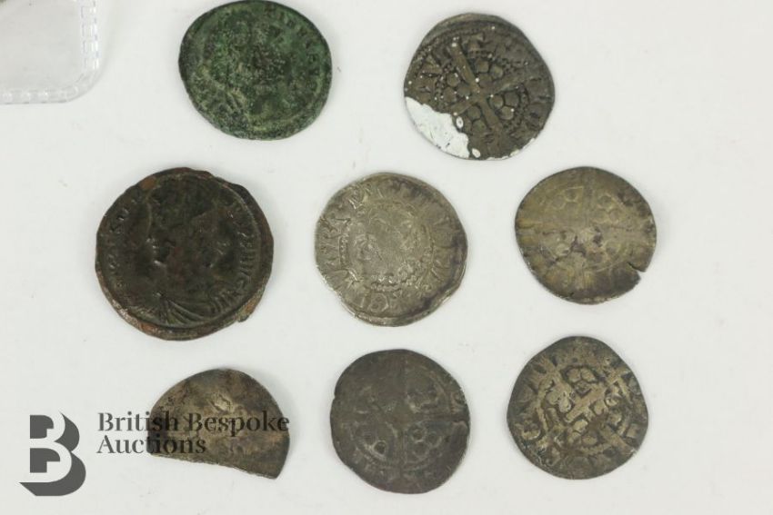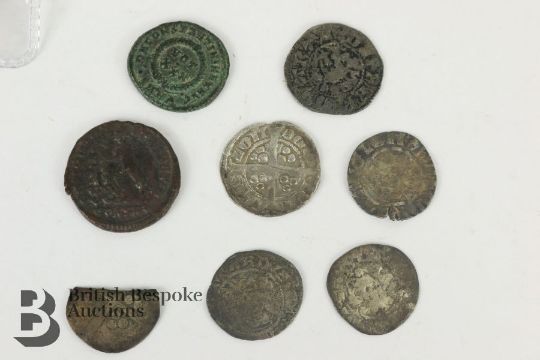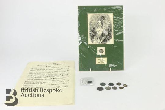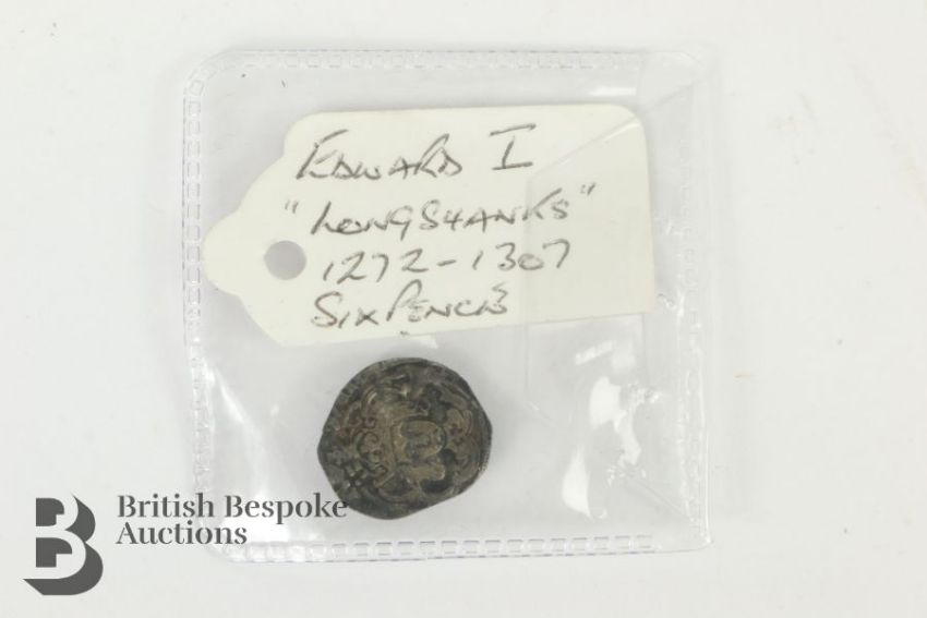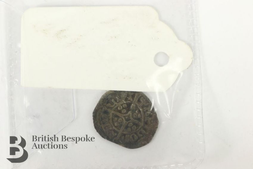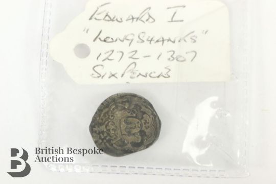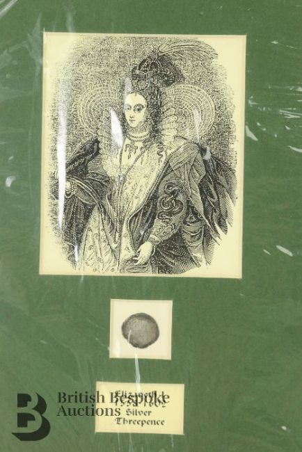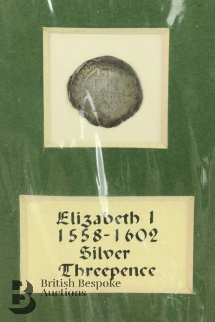 Elizabeth I (1558-1602) silver three-pence coin mounted with an engraving together with a small quantity of hammered English coins including Edward I long cross penny, and a (possibly) Henry IV penny (coin is trimmed), amongst other hammered coins.