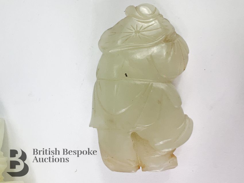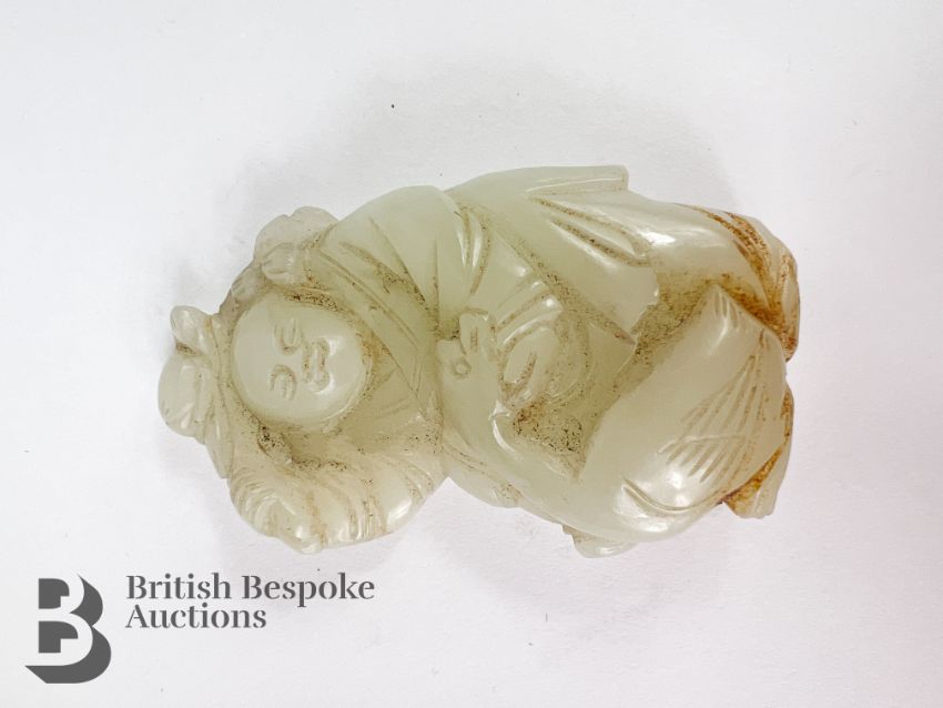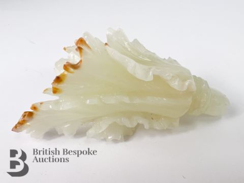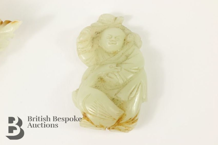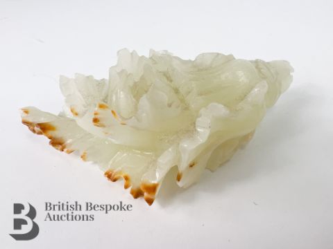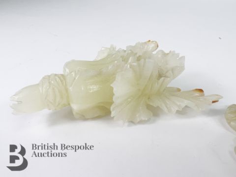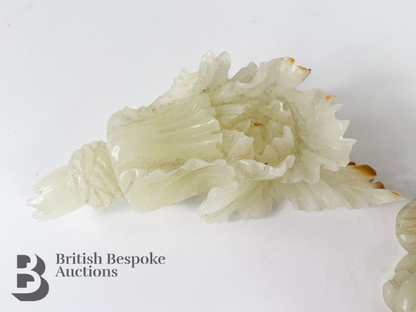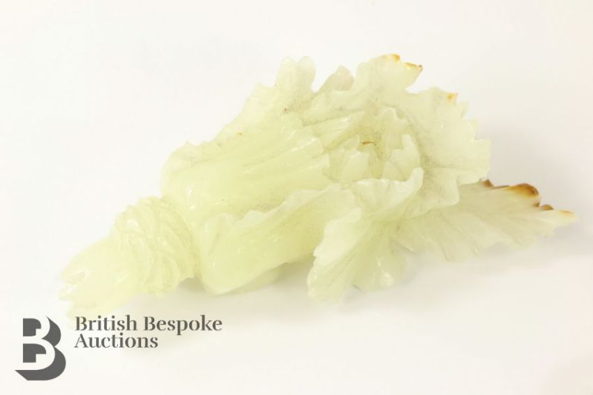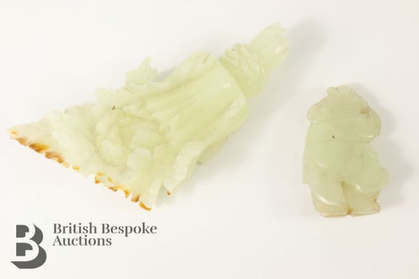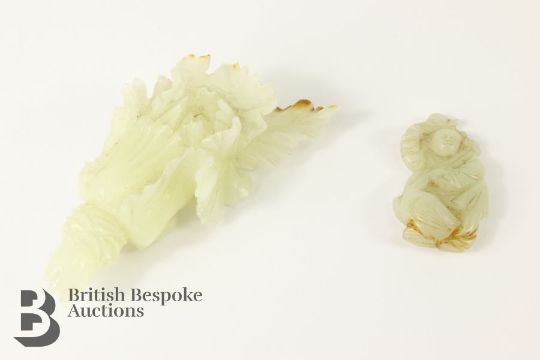 A Chinese carved jade cabbage, measures approx. 12 cms, together with a small jade carving of a man and a goose, measures approx. 6 x 3.5 cms.
