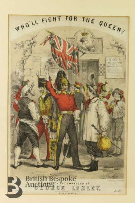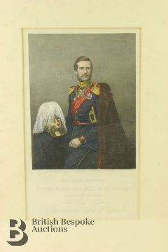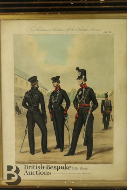 Collection of militaria prints, including music cover after Augustus Butler 'Who'll Fight for the Queen"? written and composed by George Linley, approx 22 x 33 cms framed; music cover The Guards Waltz by D. Godfrey approx 24 x 32 cms framed and glazed; a coloured engraving by D.J Pound of His Royal Highness Prince Frederick William of Prussia 19 x 32 cms; Ackermann's Costumes of the British Army 'Cape Mounted Rifles'and the '60th Kings Royal Rifle Corps' after H. Martens, engraved by J Harris, 27 x 36 cms.