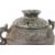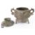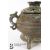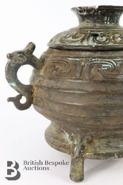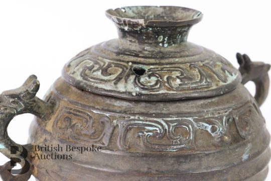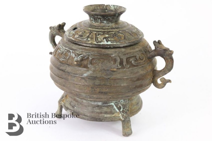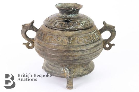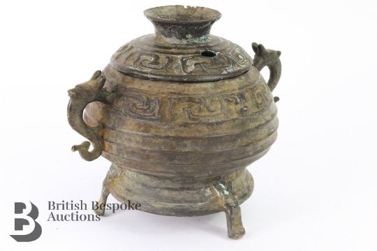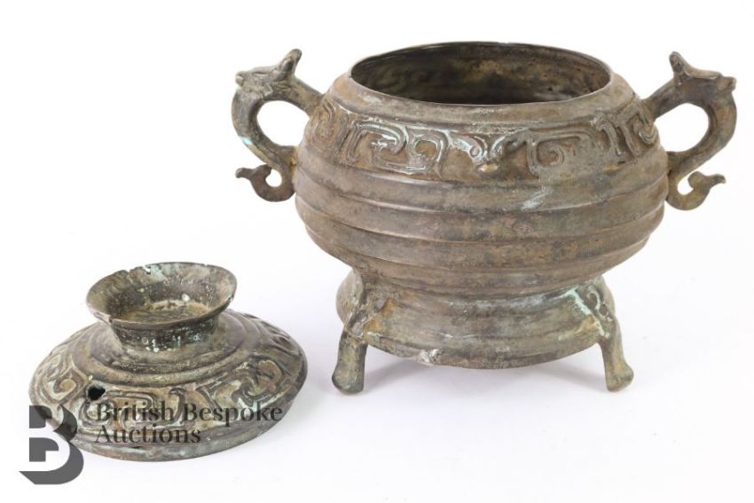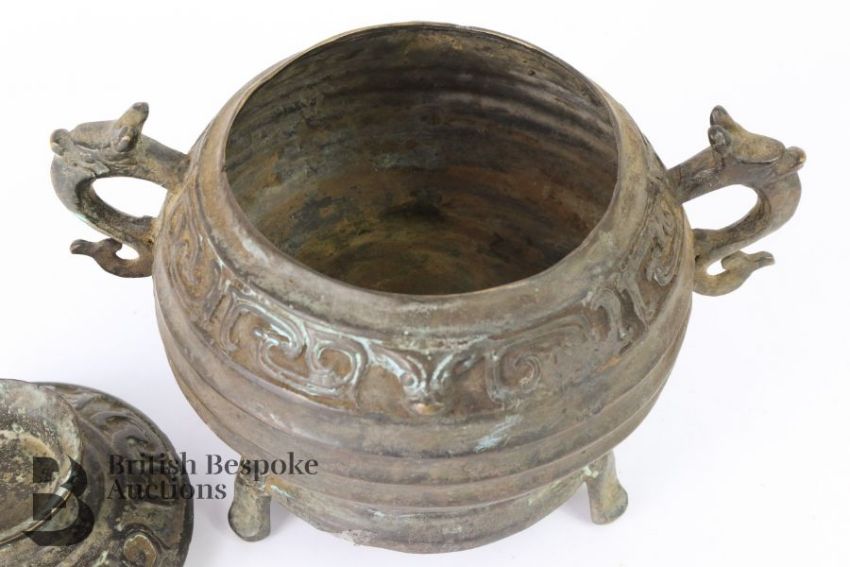 A Chinese cast bronze censor and cover. The ribbed bowl having a repeating motif border, with dragon mask handles, measures approx. w 22 x h 13 cms.